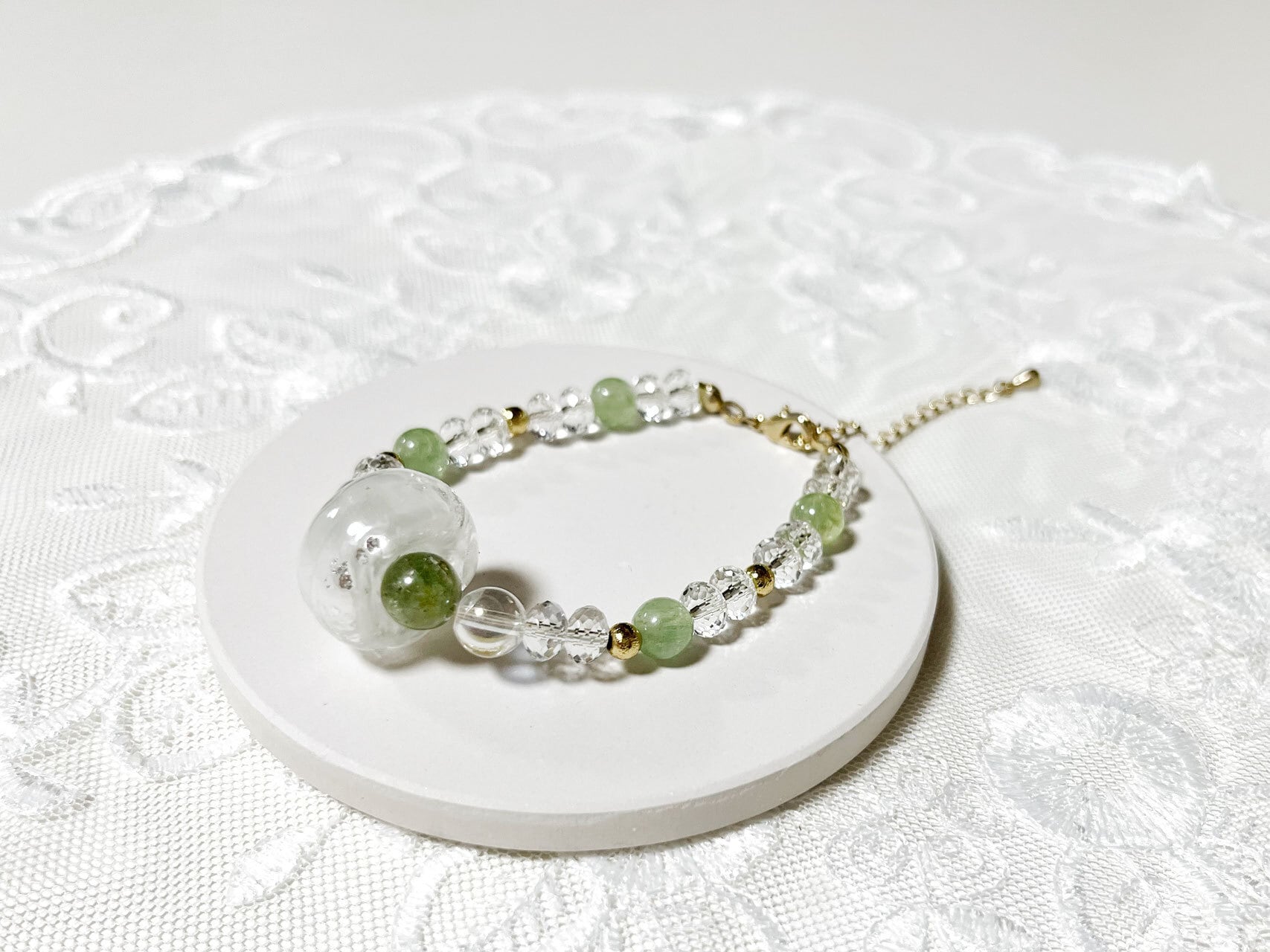ベネチアングラスのメインパーツにアロマオイルを入れて香りをまとうことができる「Bright Muse」のオリジナルアロマブレスです。