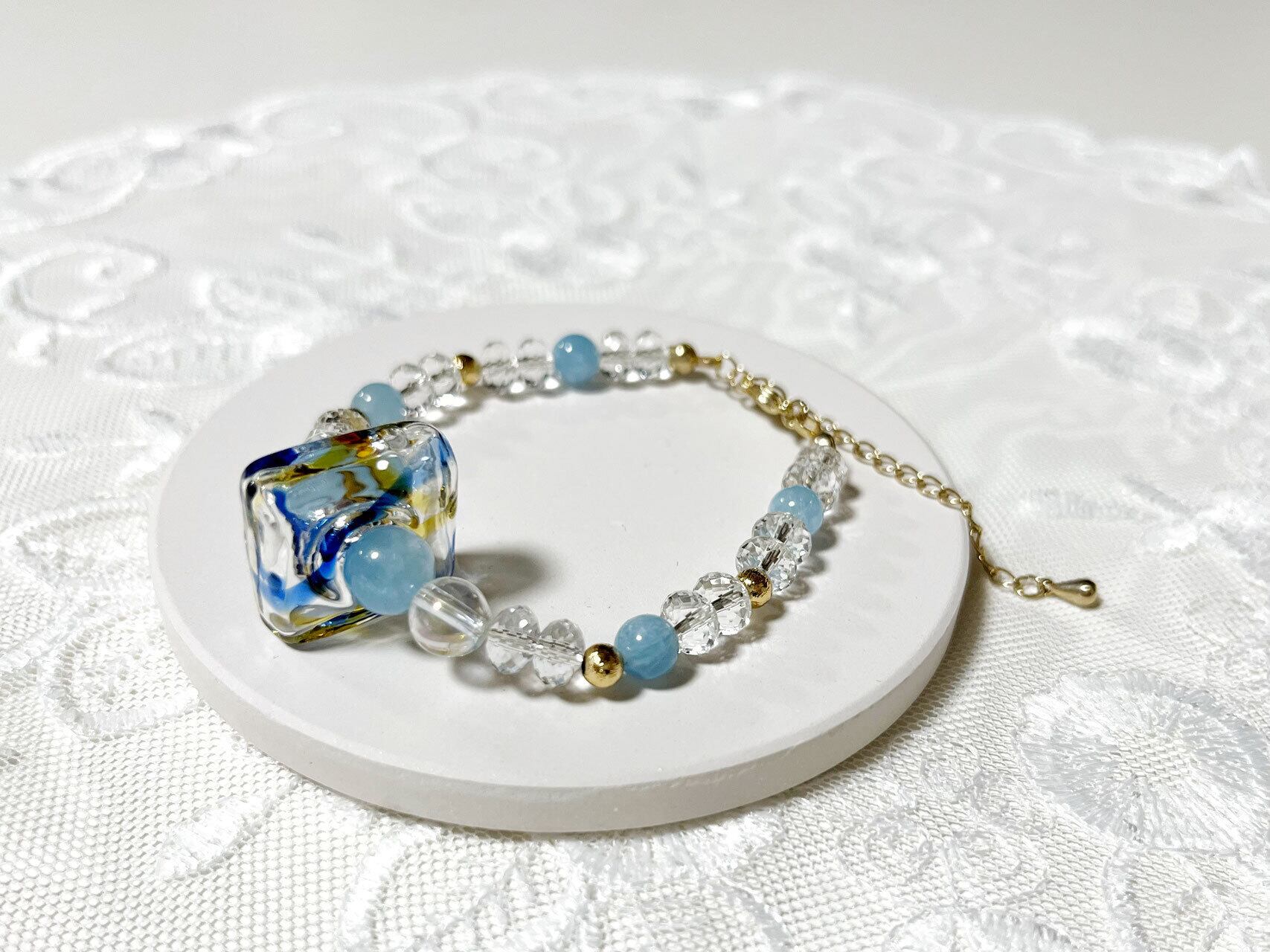 ベネチアングラスのパーツは四角い形でイエローとブルーが混じっていて、とってもかわいらしくアクアマリンの涼しげなエネルギーとマッチしています❤